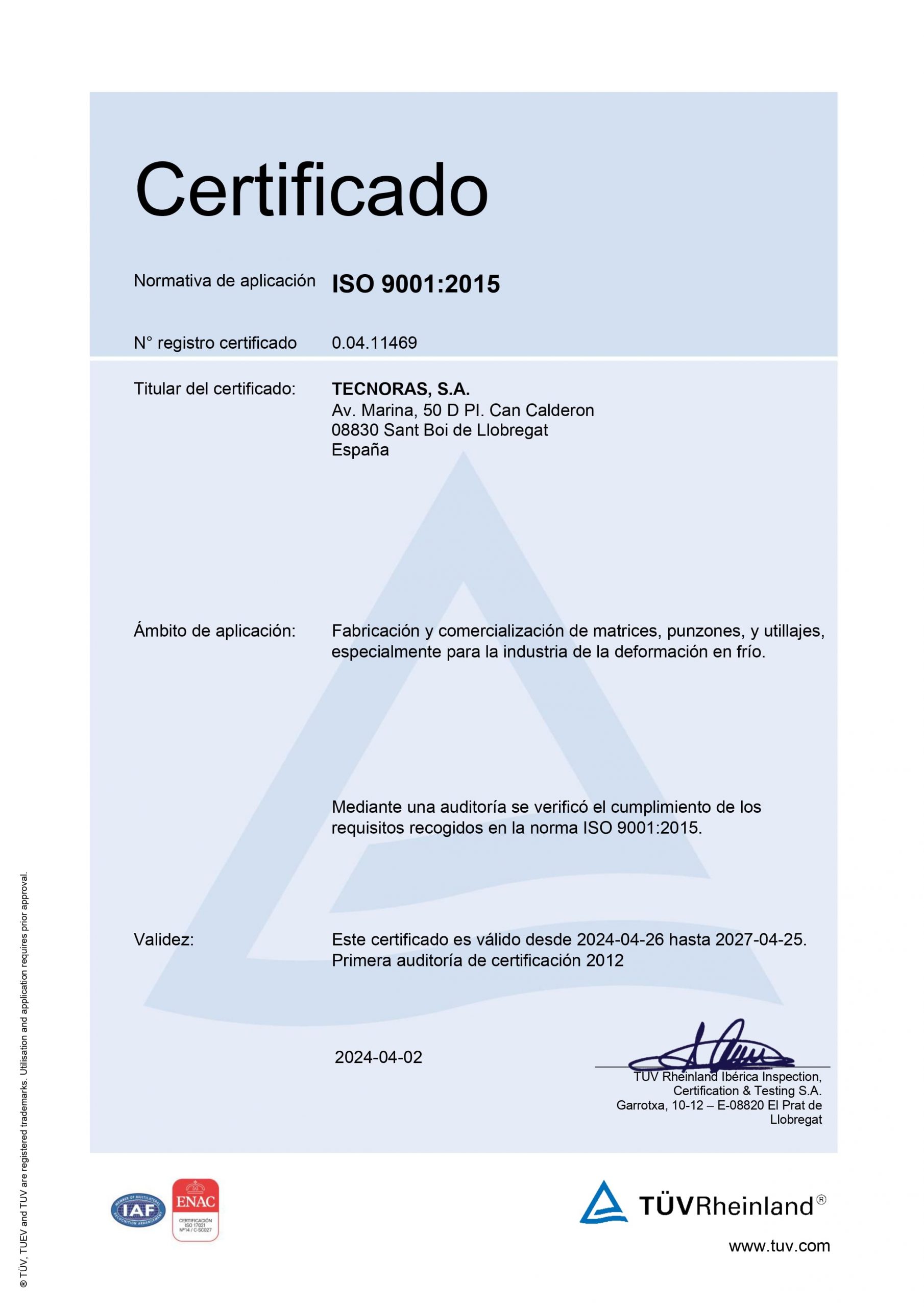 Tecnoras enfoca el sistema de qualitat com una manera per organitzar la seva vida empresarial, fonamentant-lo tant en la seva orientació cap als clients com als seus productes. Es basa en la millora contínua de l’eficàcia de la gestió, el producte i la satisfacció de les parts interessades, sempre sota la norma ISO 9001:2015.
